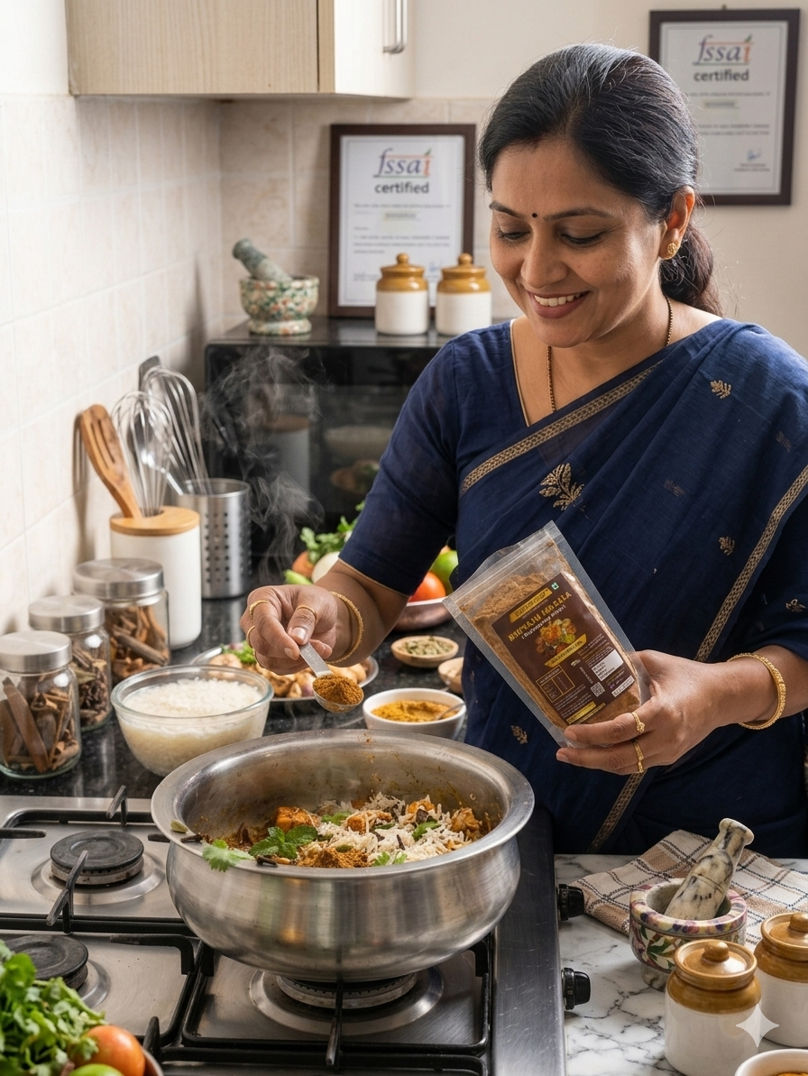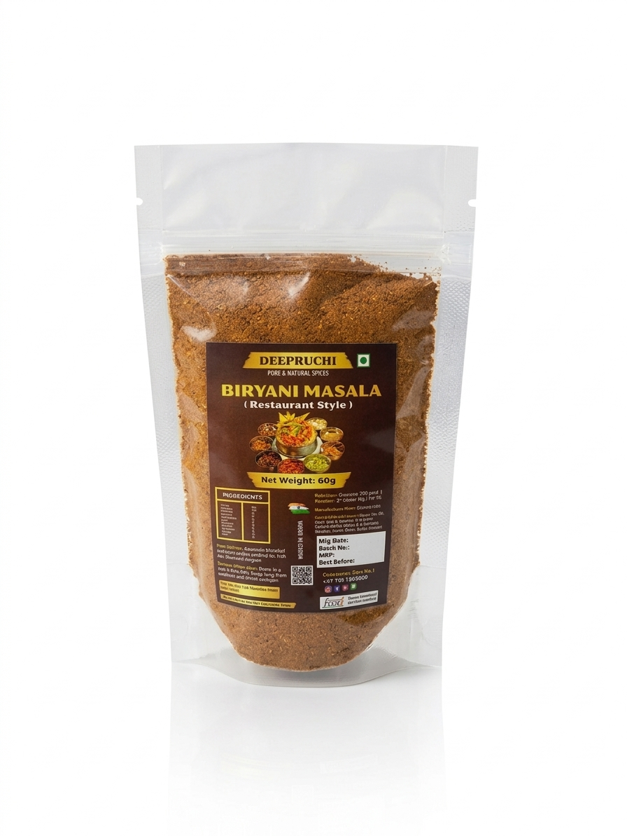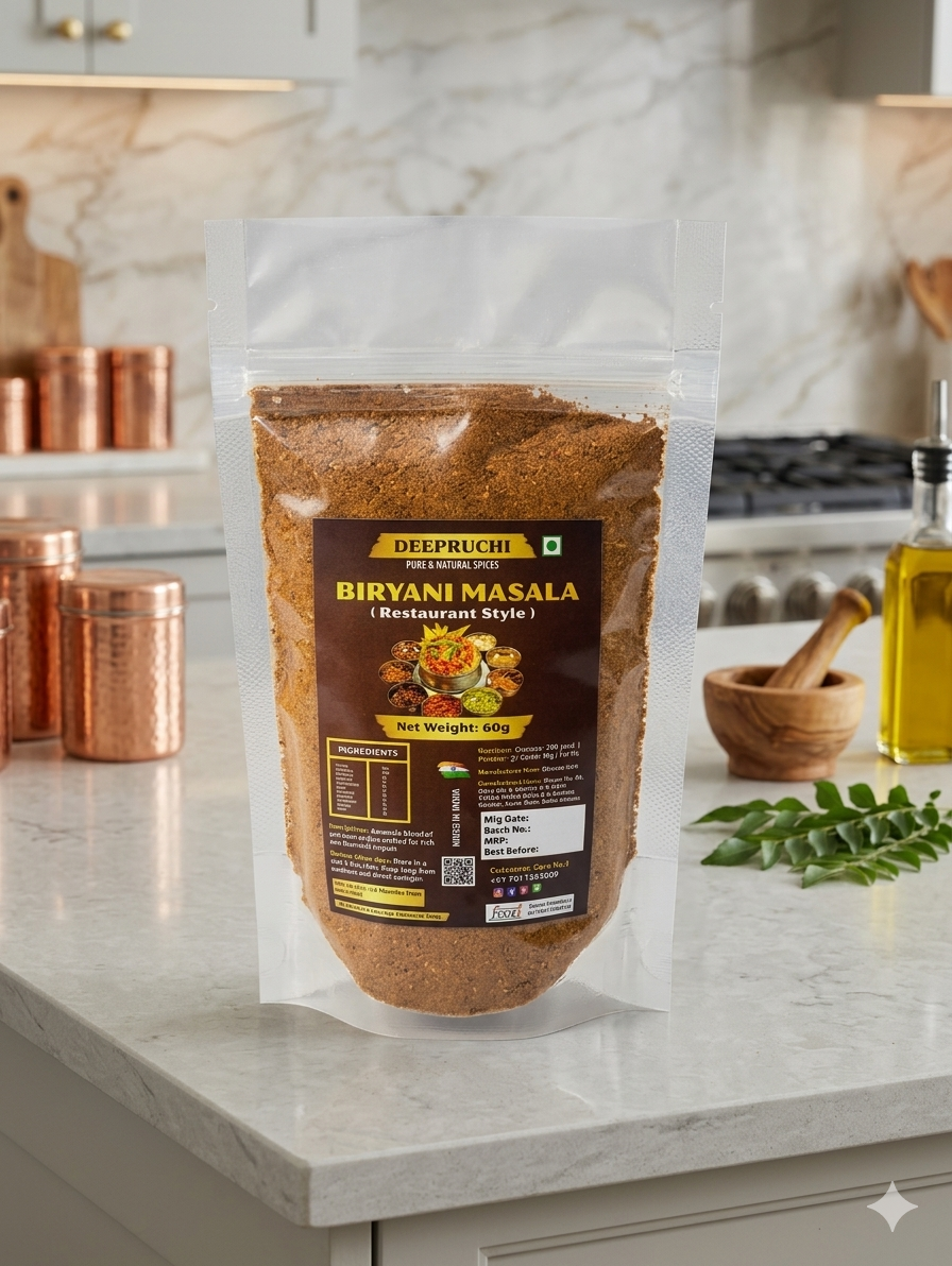 At Deepruchi, we carefully select the finest ingredients such as cumin, coriander, black pepper, cloves, cinnamon, cardamom, bay leaf, and other aromatic spices. These ingredients are naturally processed, cleaned, dried, and finely ground to preserve their original flavor and aroma. The result is a balanced spice mix that enhances the taste of your biryani without overpowering it.